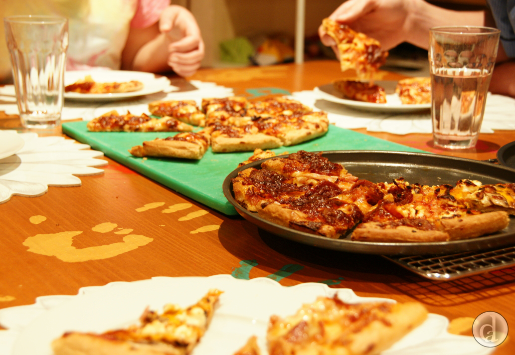 The next part is a little messy (I can imagine some children will love doing this). I usually put some disposable gloves on & coat them with a bit of oil. Spread the dough on the tray to cover it completely, if you want make the edges slightly thicker. It is easier to spread the dough with either; oil or your hands/gloves or by putting some oil on the dough.