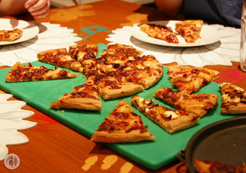 This amount of pizza dough is sufficient to make 4 pizza bases (28 cm diameter) using ~250 g of dough. The crust is thin (see photos below) & 1/2 of a pizza crust is approximately the same as 2 slices of bread. If you want a thicker crust then make 3 pizza bases each with ~350 g of dough. Adding more dough doesn't necessarily mean a thicker crust, the weight of the toppings can push down on the dough & then it doesn't rise well.