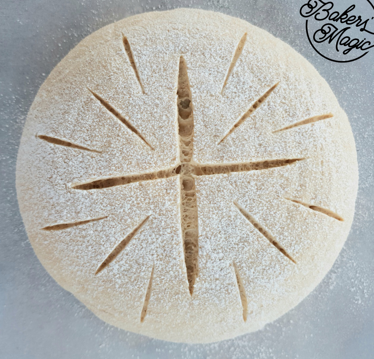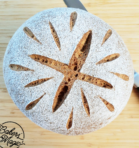 Line a baking tray with baking paper. Gently take the dough out of the basket & place onto the baking paper. Optional - using a sharp knife make slashes on the top of the dough.