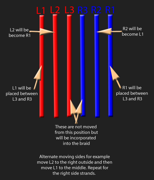 Start braiding - move the strands in the L2 or R2 position first, then follow with the strand on the outside.
