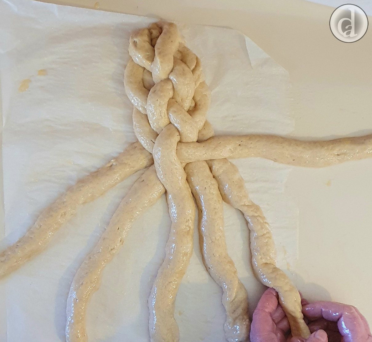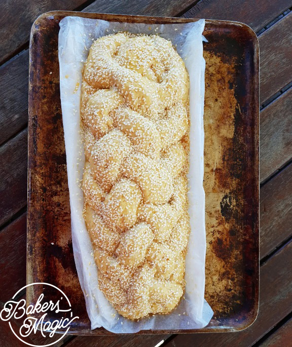 Gently move the braid (on top of the baking paper) onto a baking tray.