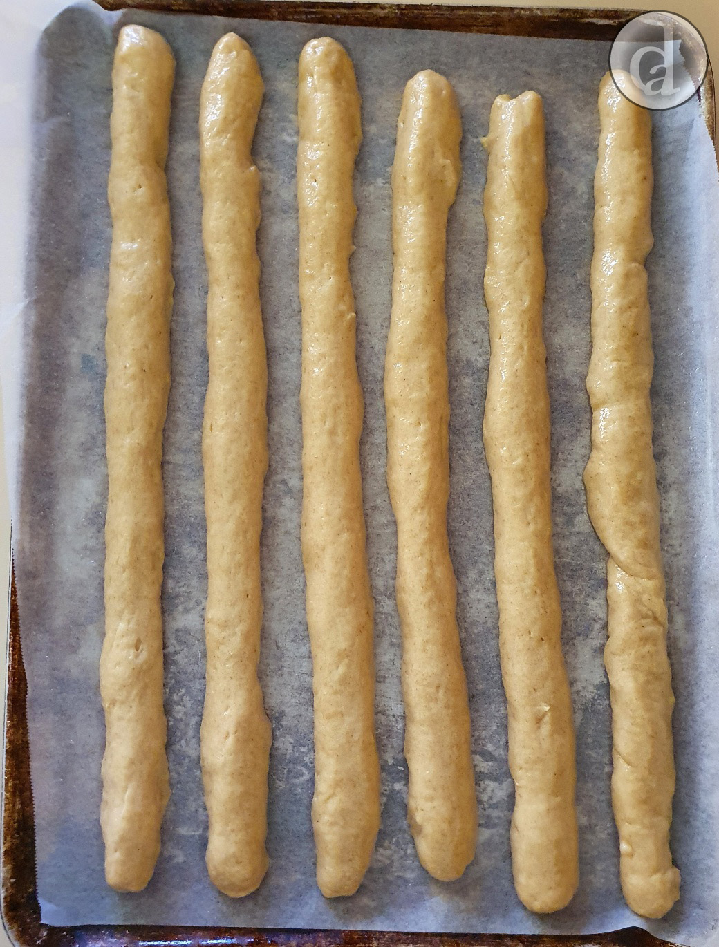 Oil your hands a little and roll out the dough into a sausage shape on the baking paper. Ensure the 'sausages' are long enough for your baking tray.