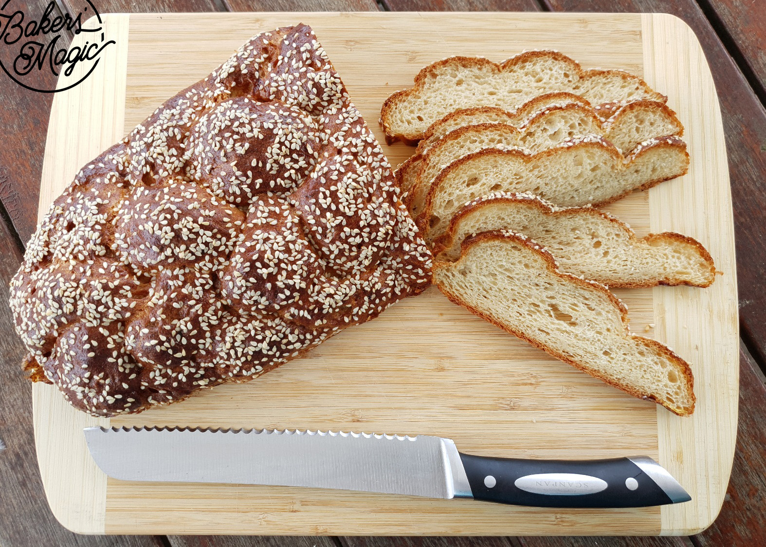 Just before placing in the oven, coat the dough with more egg wash and sprinkle with sesame seeds.