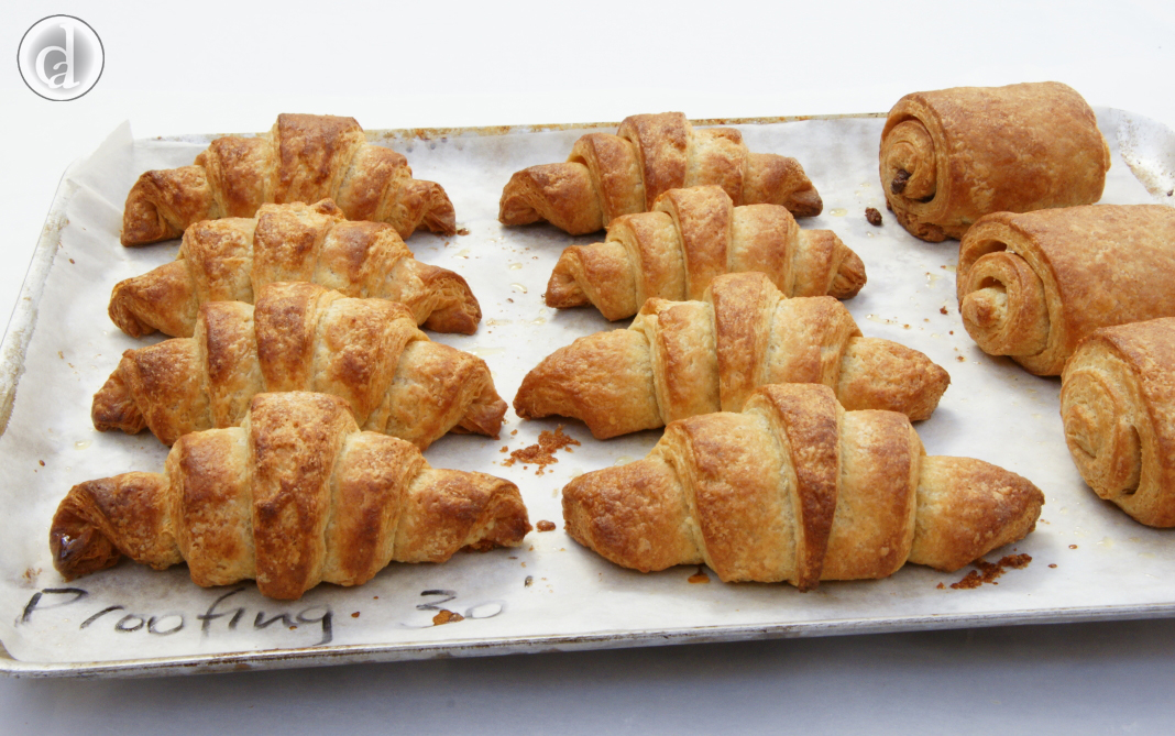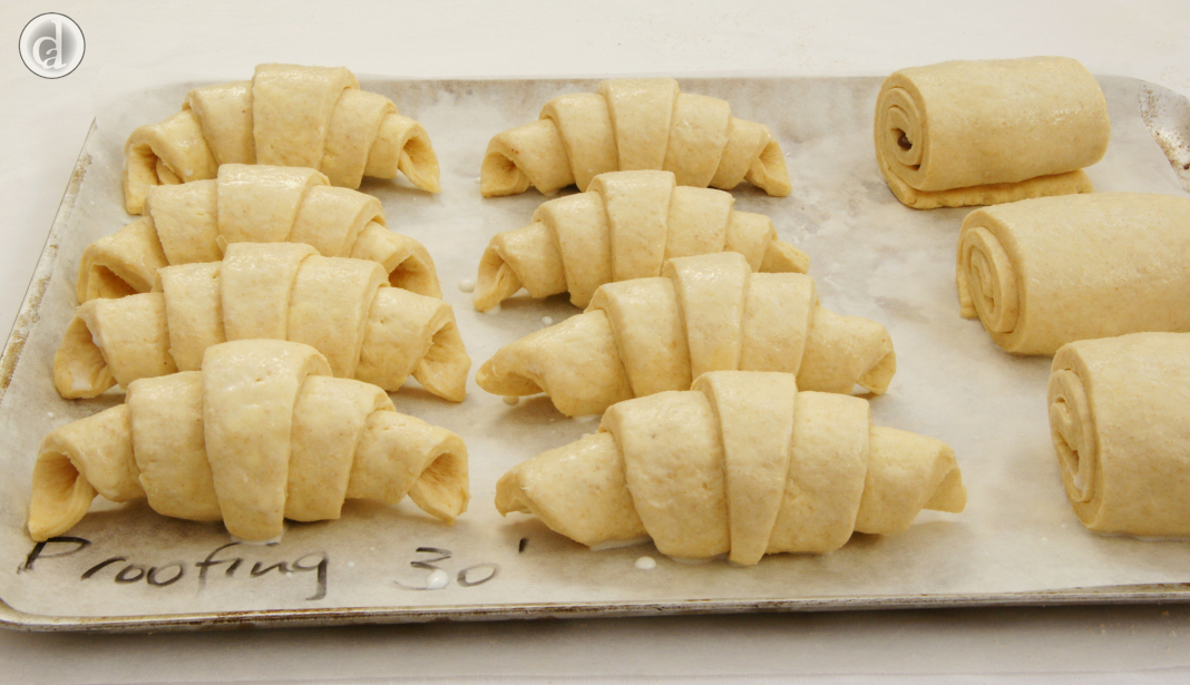 After proofing the uncooked croissants will not look like they have risen a great deal. If the croissants are proofed for longer the layers may disappear in the cooked product. If the croissants are proofed for less the yeast flavour is not as pronounced.