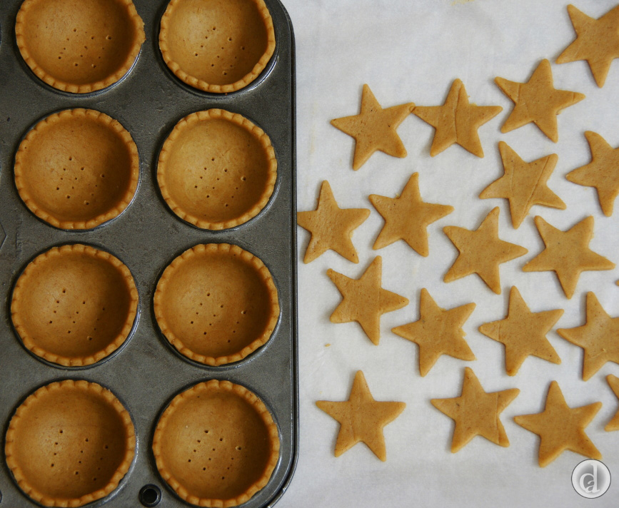 Transfer baking tray with stars & filled tart/pie pan(s) to the fridge for ~10 - 15 mins. Bring out & prick the bases of the tart cases 3 x with a fork.