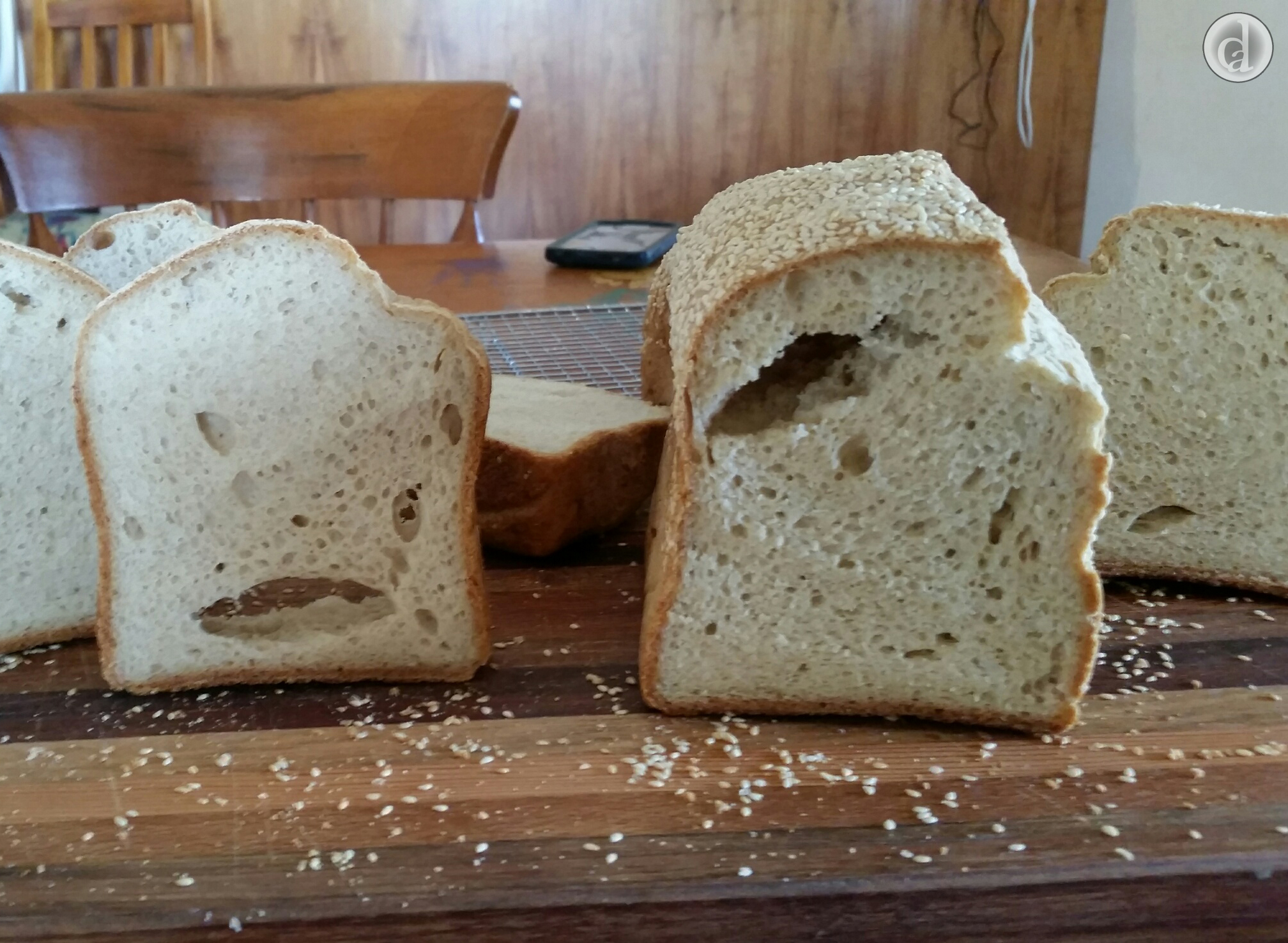 What happens if the dough is proofed, punched down then shaped & baked - without a second proofing? The dough essentially has the same volume of water in it as it did before the first proofing. If all the gas has been knocked out of the dough then theoretically zeros should form during baking. The following photo is of a bread I baked after proofing the dough for 1.5 hours, knocking/punching all air out, putting it into a baking tin and baking immediately. There are some pretty impressive zeros in the loaf. The difference between this loaf & the one pictured above was in the flavour of the bread. The yeast flavour was more pronounced in the loaf pictured below.