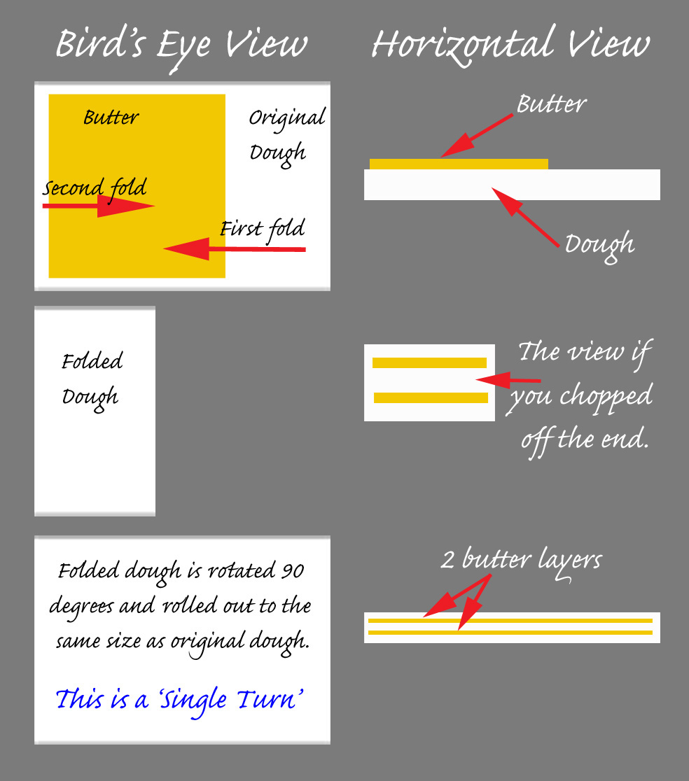 In the first diagram the butter 'slab' is encased in dough and rolled out between layers of dough.